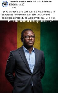 « Après avoir pris une part active et déterminée à la campagne référendaire aux côtés du Ministre Secrétaire général du Gouvernement dans la circonscription de Kissidougou, je me réjouis de l’adoption massive de la nouvelle Constitution, plébiscitée par plus de 84 % de notre population électorale », a déclaré Joachim Baba Millimouno sur sa page Facebook.